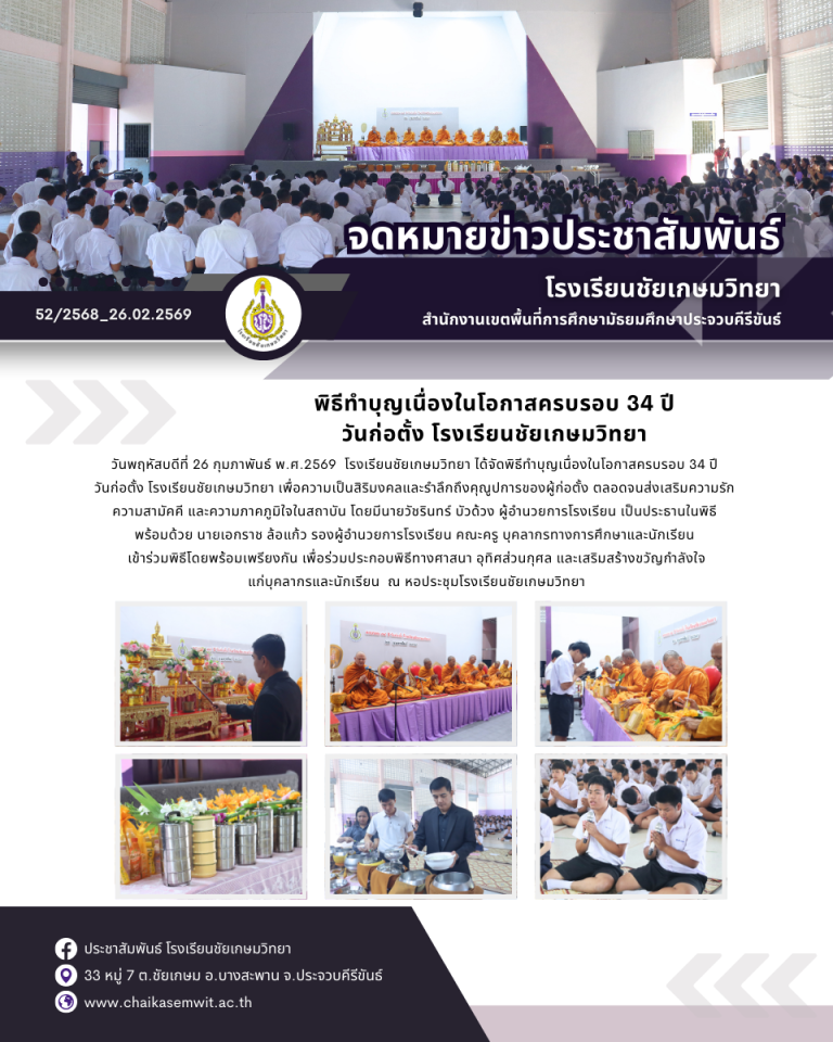 กิจกรรม พิธีทำบุญเนื่องในโอกาสครบรอบ 34 ปี วันก่อตั้ง โรงเรียนชัยเกษมวิทยากุมภาพันธ์ 26, 2026กุมภาพันธ์ 26, 2026