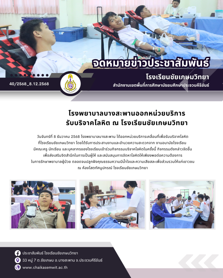กิจกรรม โรงพยาบาลบางสะพานออกหน่วยบริการรับบริจาคโลหิต ณ โรงเรียนชัยเกษมวิทยาธันวาคม 9, 2025ธันวาคม 9, 2025