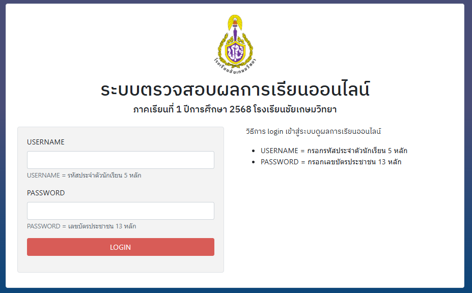 PASSWORD = กรอกรหัสผ่านเป็นรหัสประจำตัวประชาชนของนักเรียน แล้วคลิก login เพื่อเข้าสู่ระบบดูเกรดออนไลน์