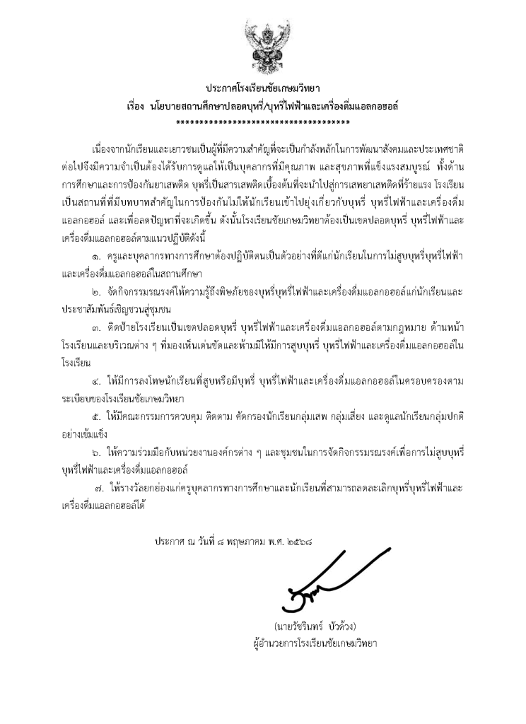 ประกาศโรงเรียนชัยเกษมวิทยา