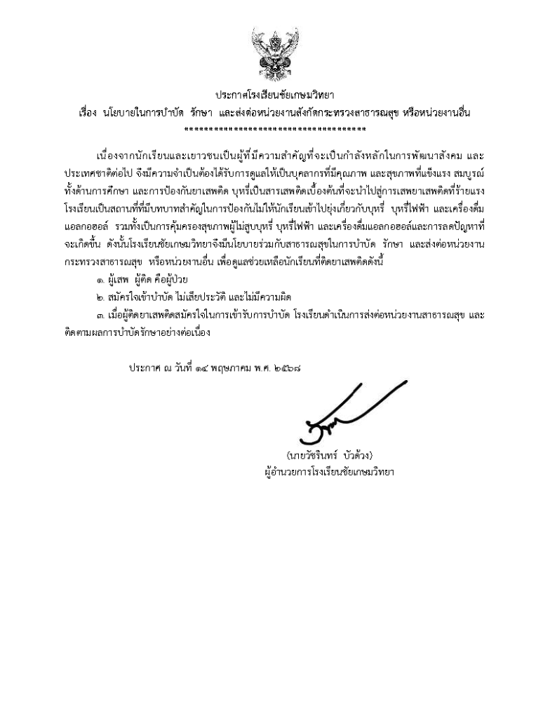 เนื่องจากนักเรียนและเยาวชนเป็นผู้ที่มีความสำคัญที่จะเป็นกำลังหลักในการพัฒนาสังคม และประเทศชาติต่อไป จึงมีความจำเป็นต้องได้รับการดูแลให้เป็นบุคลากรที่มีคุณภาพ และสุขภาพที่แข็งแรง สมบูรณ์ ทั้งด้านการศึกษา และการป้องกันยาเสพติด โรงเรียนเป็นสถานที่ที่มีบทบาทสำคัญในการป้องกันไม่ให้นักเรียนเข้าไปยุ่งเกี่ยวกับบุหรี่ บุหรี่ไฟฟ้า และเครื่องดื่มแอลกอฮอล์ ดังนั้นโรงเรียนชัยเกษมวิทยาจึงมีนโยบายร่วมกับสาธารณสุขในการบำบัด รักษา และส่งต่อหน่วยงาน กระทรวงสาธารณสุข หรือหน่วยงานอื่น เพื่อดูแลช่วยเหลือนักเรียนที่ติดยาเสพติด ดังประกาศนี้