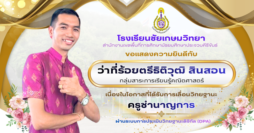 โรงเรียนชัยเกษมวิทยา ขอแสดงความยินดีกับ ว่าที่ร้อยตรีธิติวุฒิ สินสอน ครูกลุ่มสาระการเรียนรู้คณิตศาสตร์ เนื่องในโอกาสได้รับการเลื่อนวิทยฐานะ ครูชำนาญการ ผ่านระบบประเมินวิทยฐานะดิจิทัล Digital Performance Appraisal (DPA)
