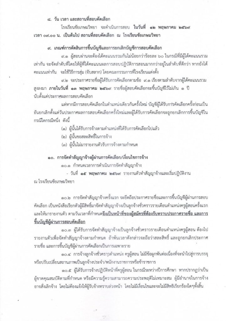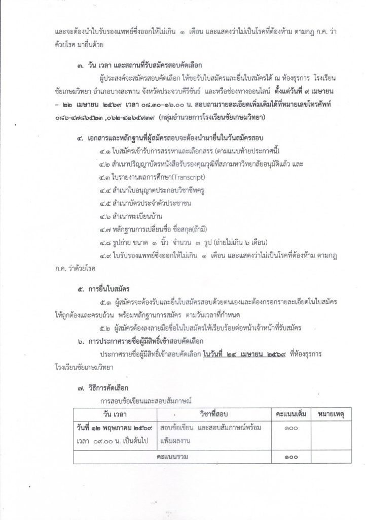 ขอรับใบสมัครและยื่นใบสมัครได้ ณ ห้องธุรการ อาคาร 1 กลุ่มอำนวยการ โรงเรียนชัยเกษมวิทยา อ.บางสะพาน จ.ประจวบคีรีขันธ์ ตั้งแต่วันที่ 9 – 22 เมษายน 2569 เวลา 08.00 – 16.00 น.