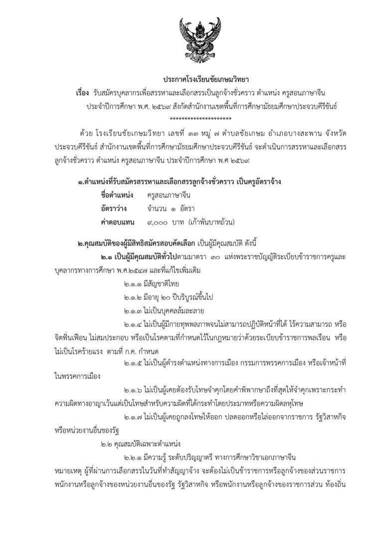 รับสมัครบุคลากรเพื่อสรรหาและเลือกสรรเป็นลูกจ้างชั่วคราว ตำแหน่ง ครูสอนภาษาไทย จำนวน 1 อัตรา